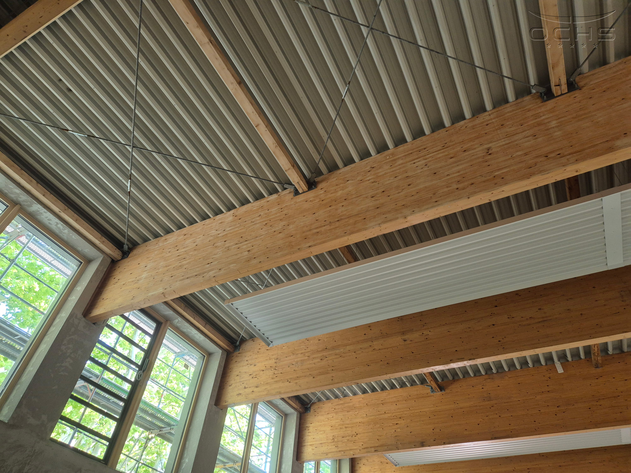 Bauweise: Stahlbetonmassivkonstruktion der erdberührten und aufgehenden Bauteile, das weitgespannte Tragwerk über der Sporthalle besteht aus Brettschichtholzbindern.