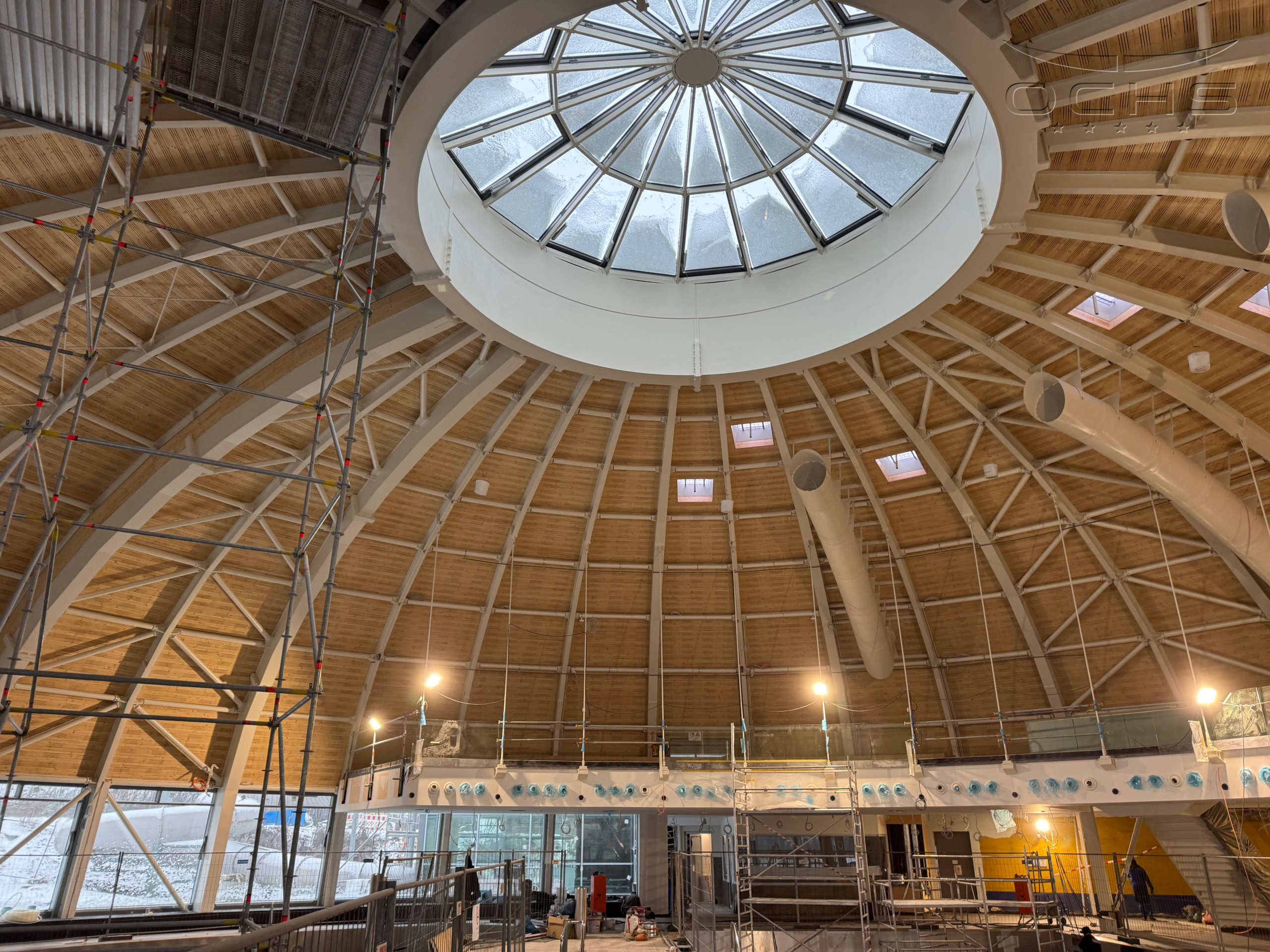 Bauweise: Stahlkuppelkonstruktion mit Holzakustikelementen